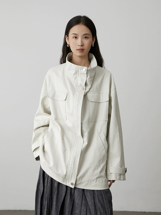 [White Gull] CAREMIND beige large pocket tooling jacket jacket casual loose silhouette short trench coat