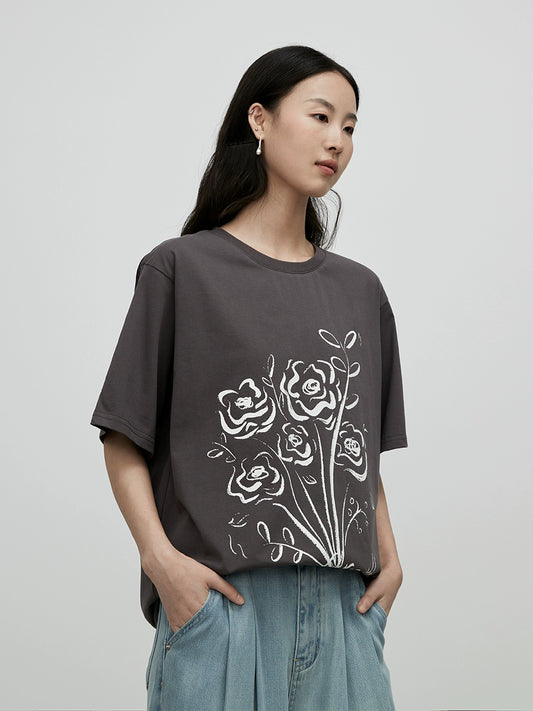 [Wanton growth] CAREMIND summer American loose short-sleeved top chic hand-painted rose crew neck T-shirt