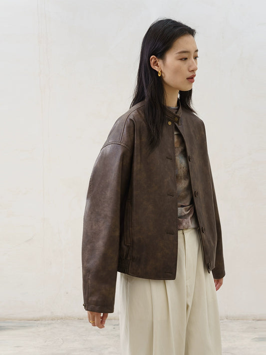 [Urban Nomad] CAREMIND retro yellow-brown leather jacket Merad stand-up collar temperament top