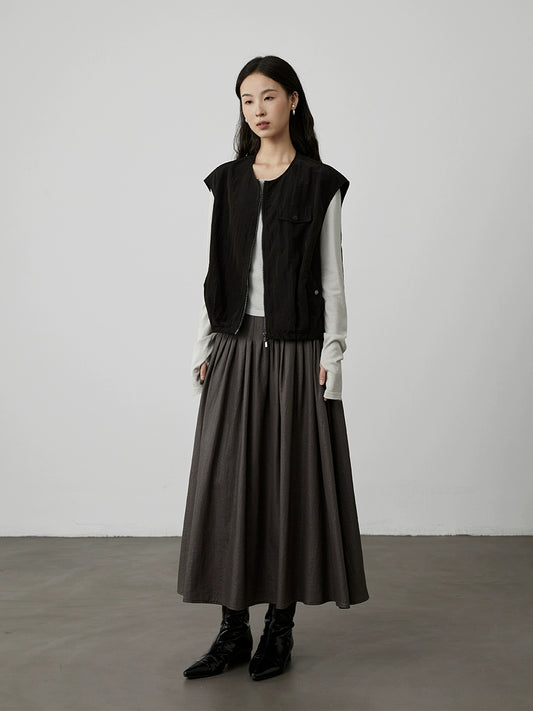 [Traveler] CAREMIND Simple dark gray green sleeveless dress tooling drawstring loose vest skirt
