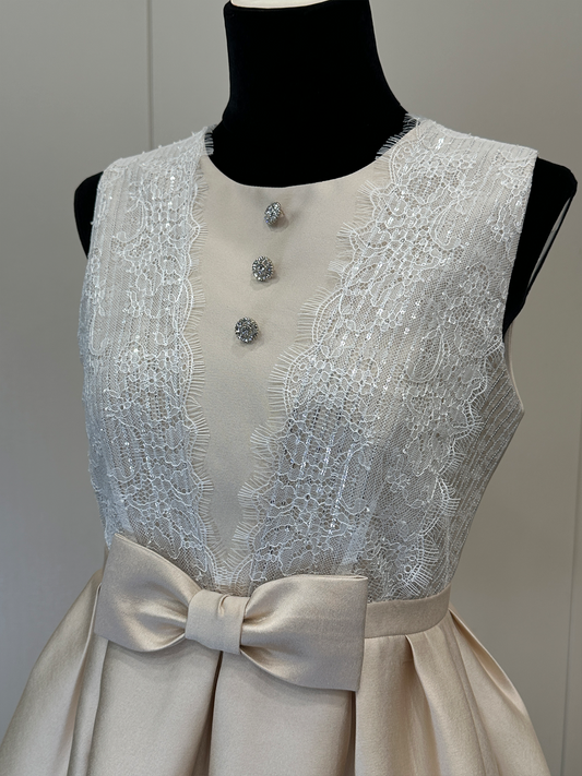 8018★ French simple commuter style premium pearl button bow white high-waisted slim dress