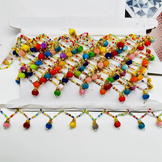 3682 Cortinas de cuentas hechas a mano de estilo étnico con pequeñas bolas de colores, falda de baile de encaje con flecos, orejas de bigotes, lámparas antiguas, decoración colgante recta