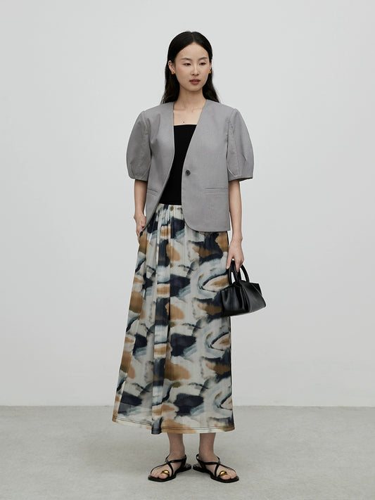 CAREMIND Falda de terciopelo con textura plisada de cintura alta con ondulación de agua y salpicaduras de tinta estilo nacional gris de otoño