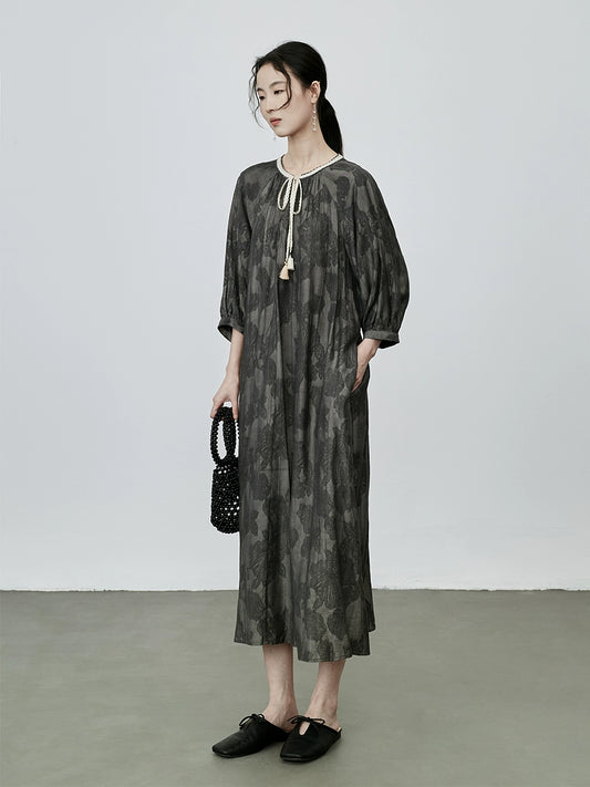 Vestido ancho con estampado de plantas en gris de CAREMIND, vestido mediano de cinco mangas y tirantes tejidos en el cuello