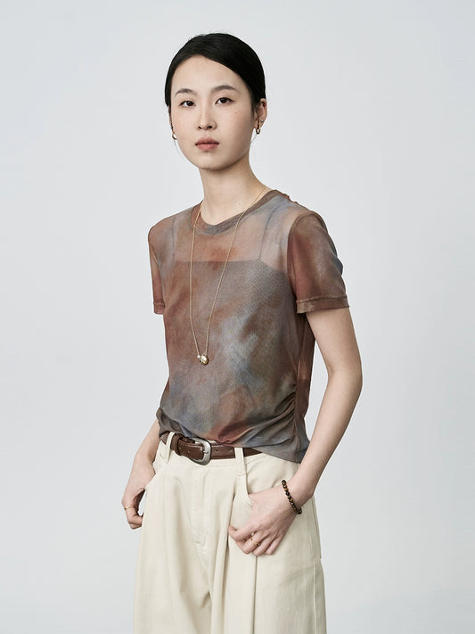 Camiseta ajustada de manga corta con cuello redondo, malla con efecto tie-dye y diseño de manchas de atardecer de CAREMIND