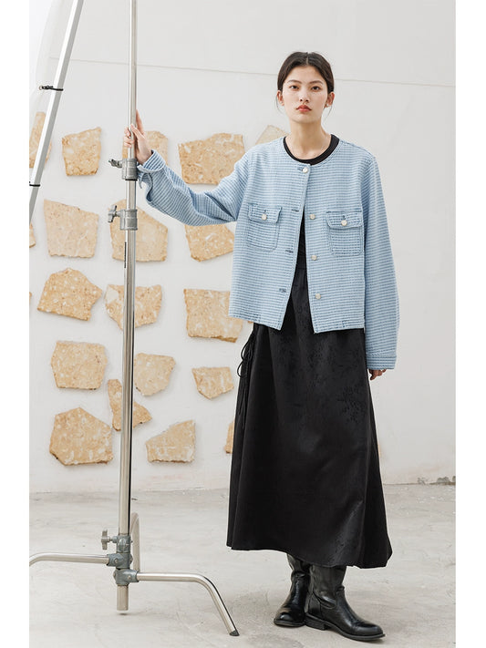 [Oferta especial por tiempo limitado] Chaqueta corta ligera de lujo francesa Xiaoxiangfeng, cuello redondo azul de alta gama, ajustada, para usar al aire libre