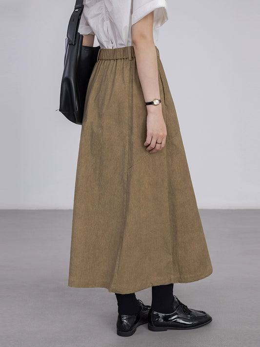 [Oferta especial por tiempo limitado] Falda larga y mediana con cordón retro de color caqui, cintura alta semielástica, falda con palabra A