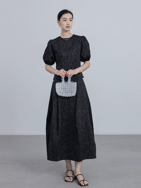 [Oferta por tiempo limitado] Conjunto de dos piezas de camiseta de manga corta con cuello redondo y falda de cintura alta con textura tridimensional en jacquard