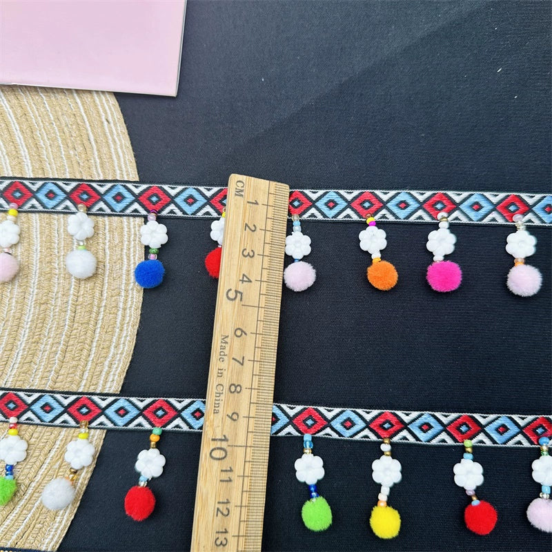 3718 Exquisita cortina de cuentas colgantes de estilo étnico con pequeñas bolas de pelo de color flor de ciruelo, accesorios de ropa para cortinas DIY de encaje