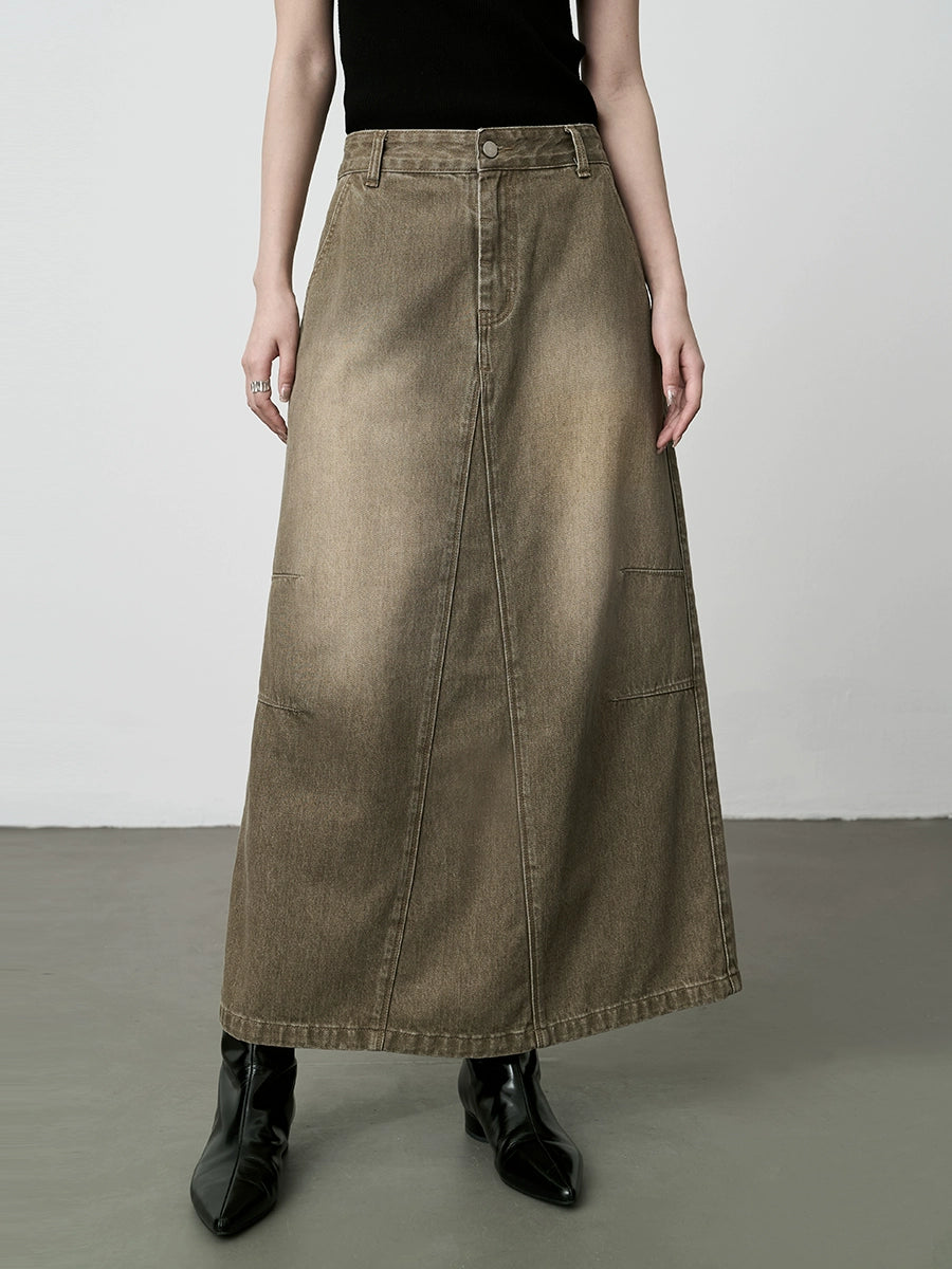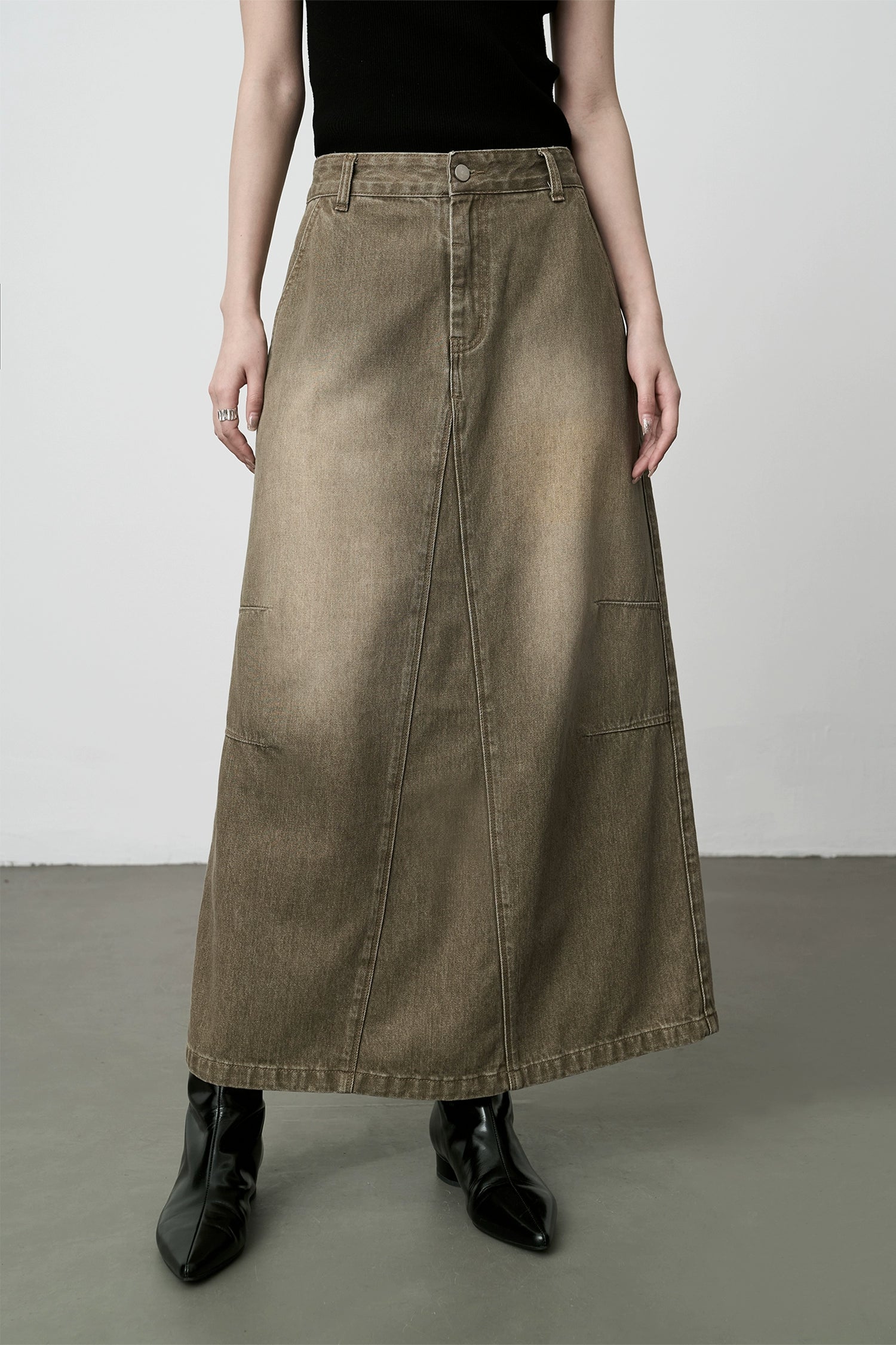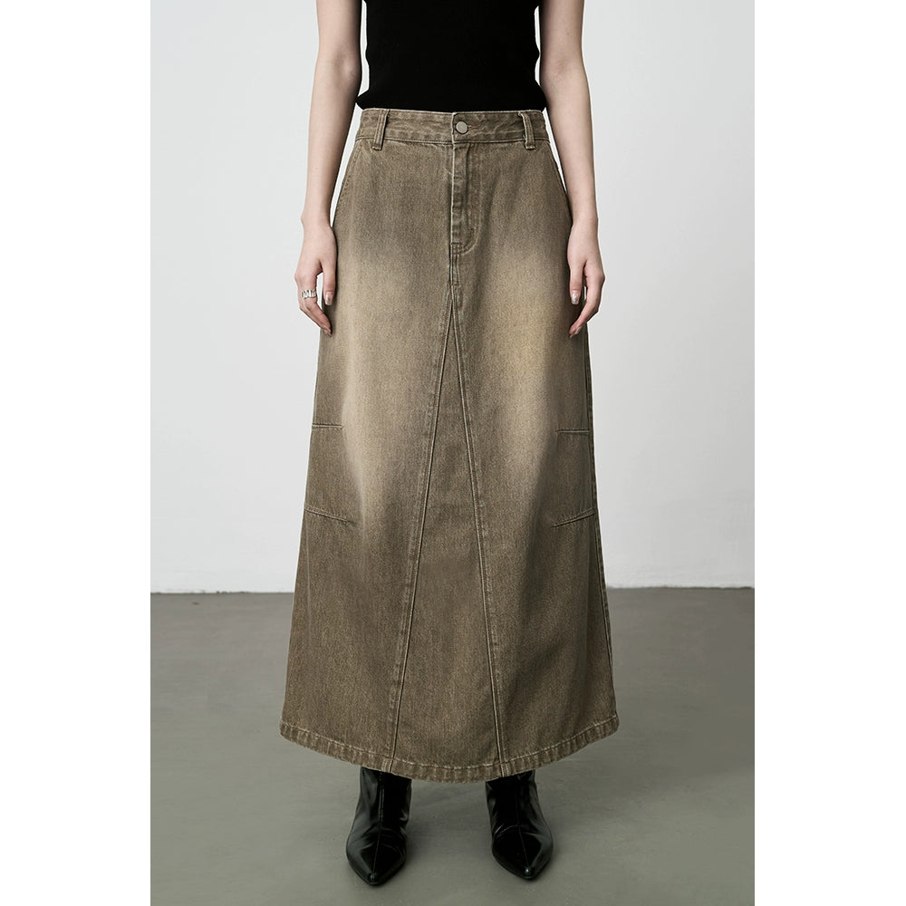 Falda vaquera antigua retro americana CAREMIND 2024, cintura alta, palabra A, falda larga de algodón con abertura