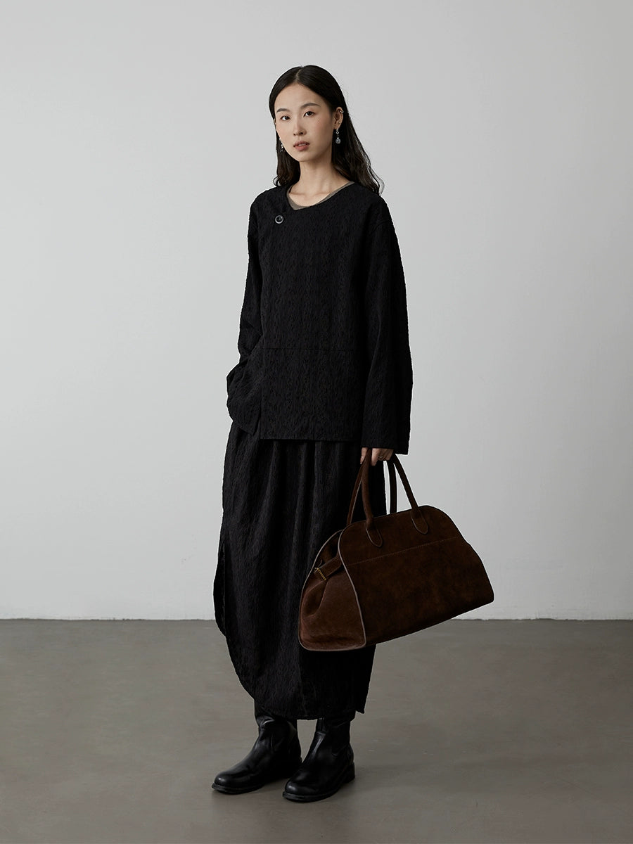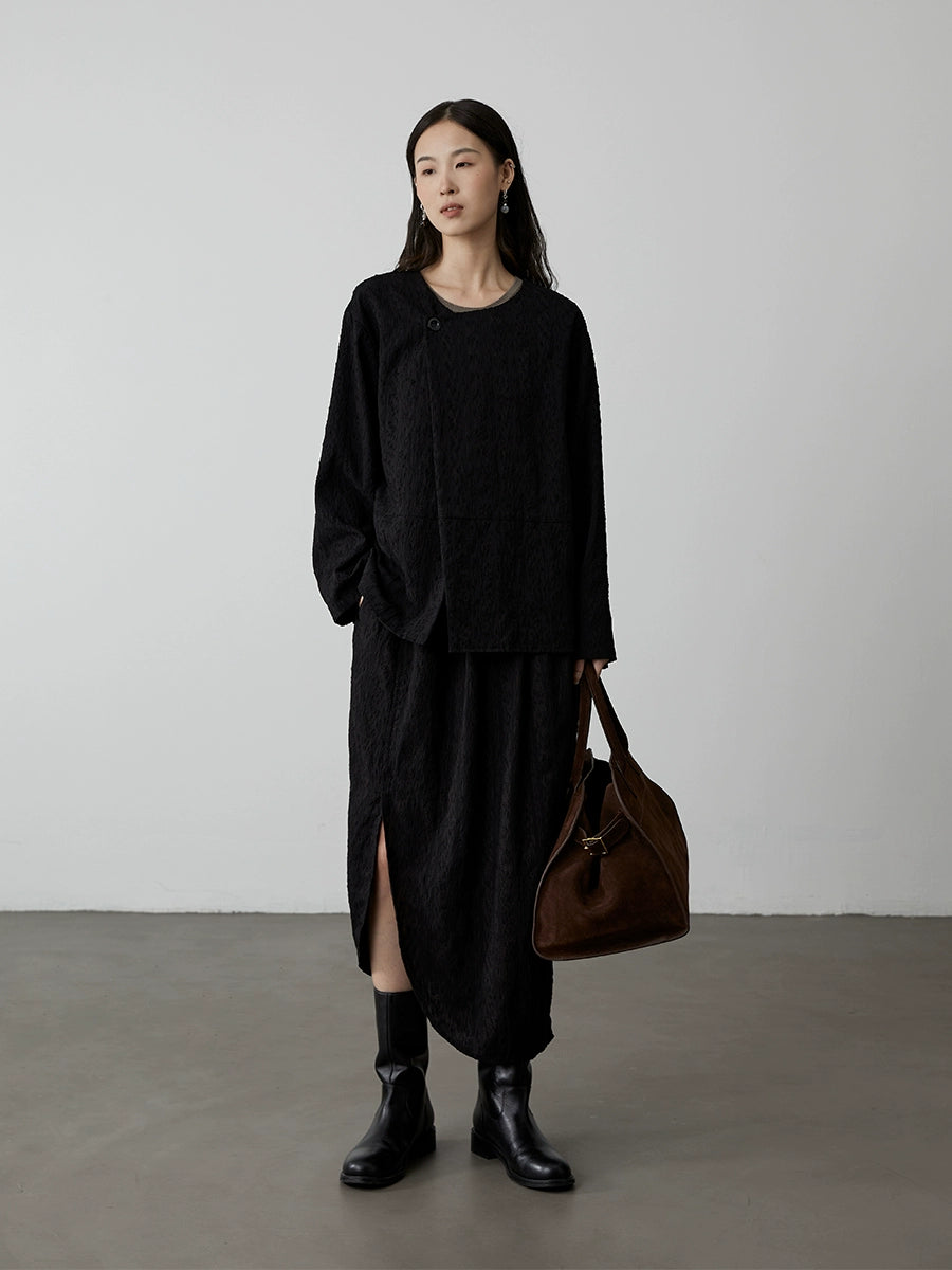 Falda de busto curvo elegante con textura negra de CAREMIND, falda de corte inclinado con abertura lateral y temperamento alto para otoño