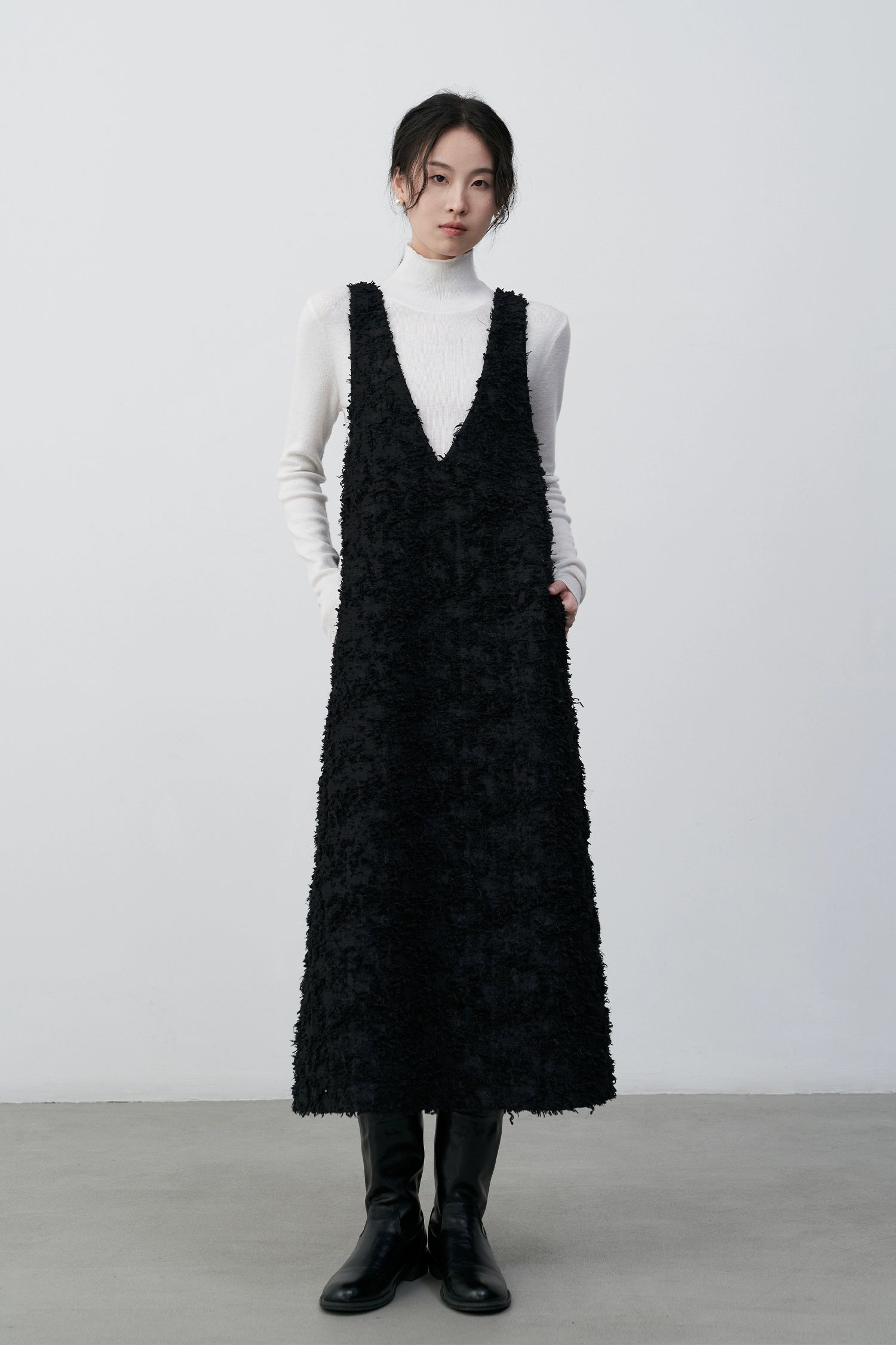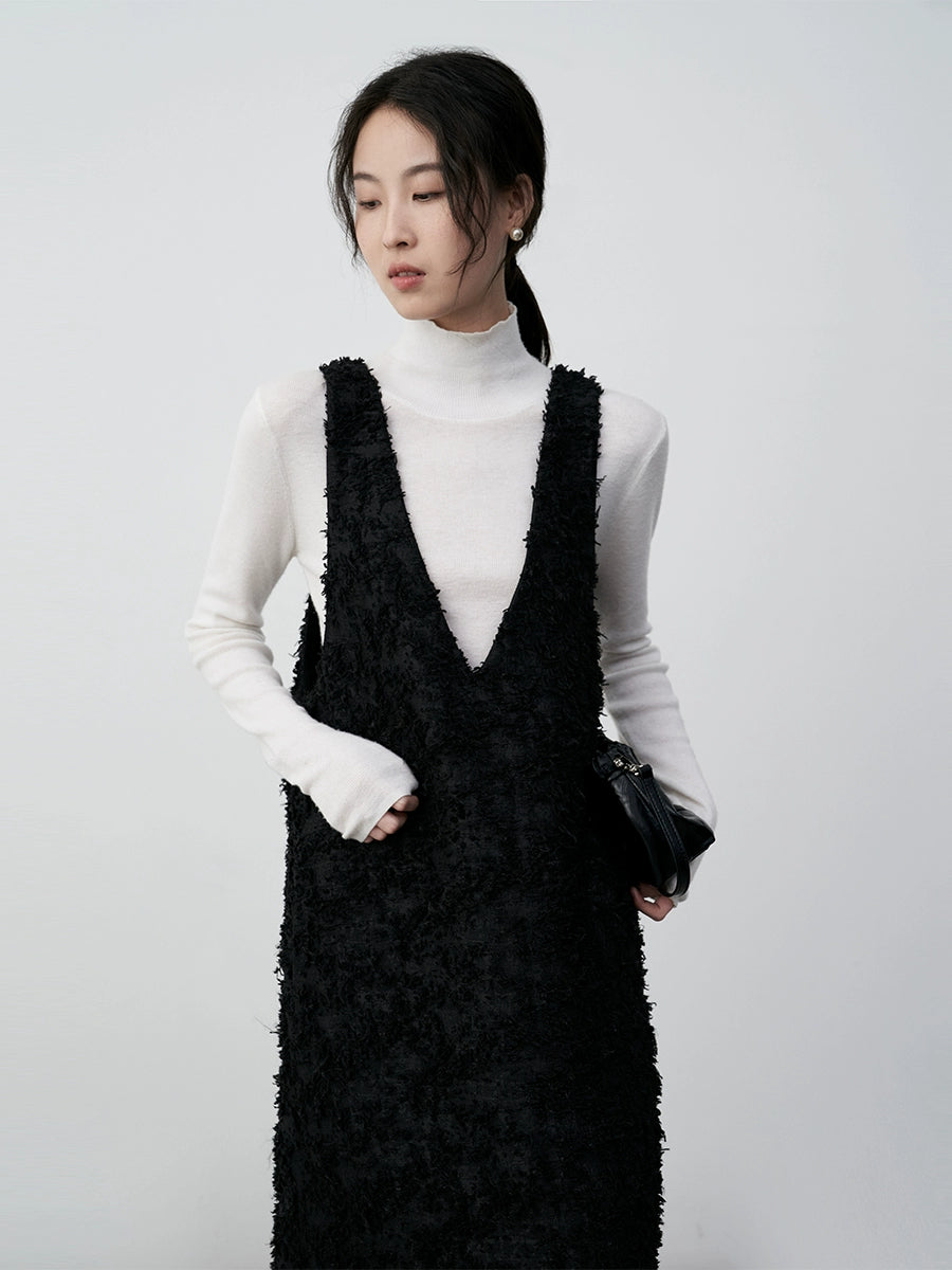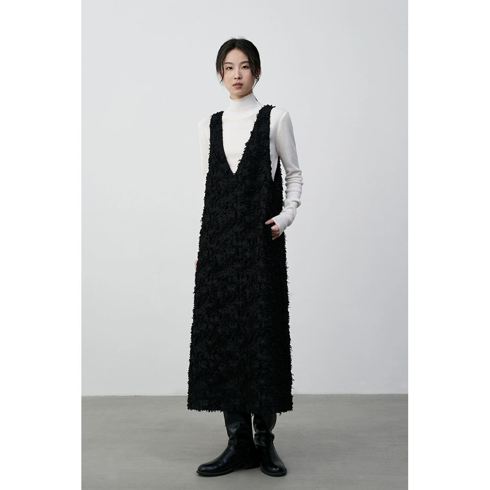 Chaleco con escote en V negro CAREMIND, falda larga, falda apilada, diseño con flecos, chaleco versátil, vestido para mujer
