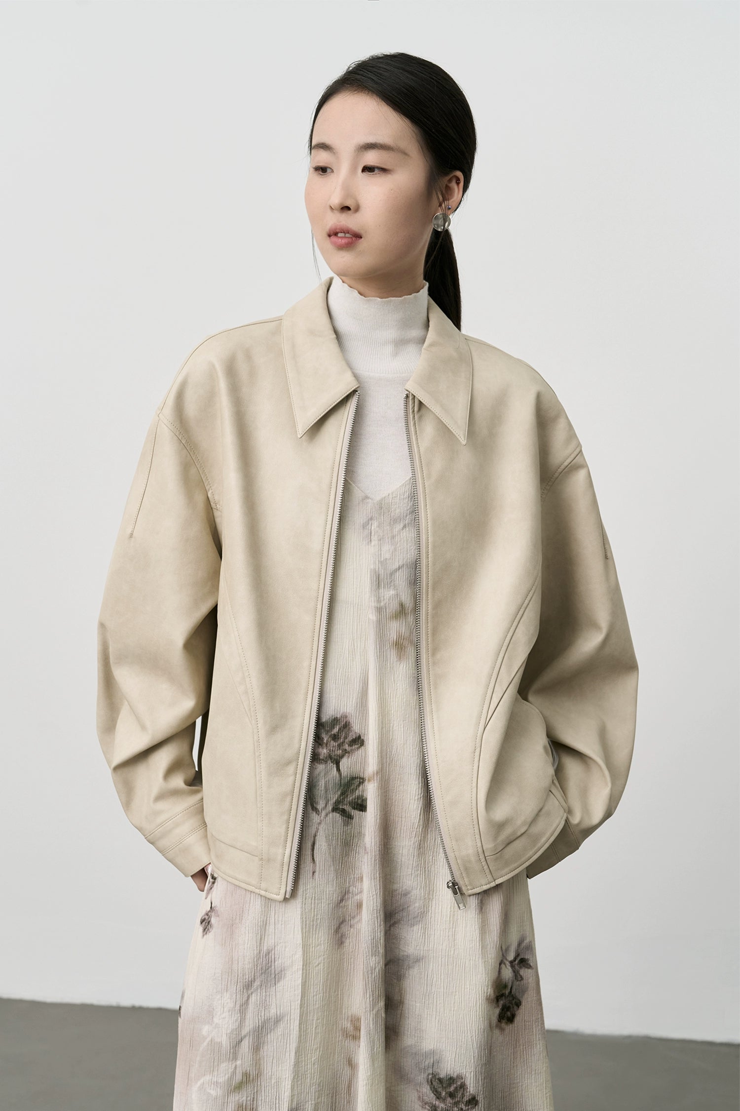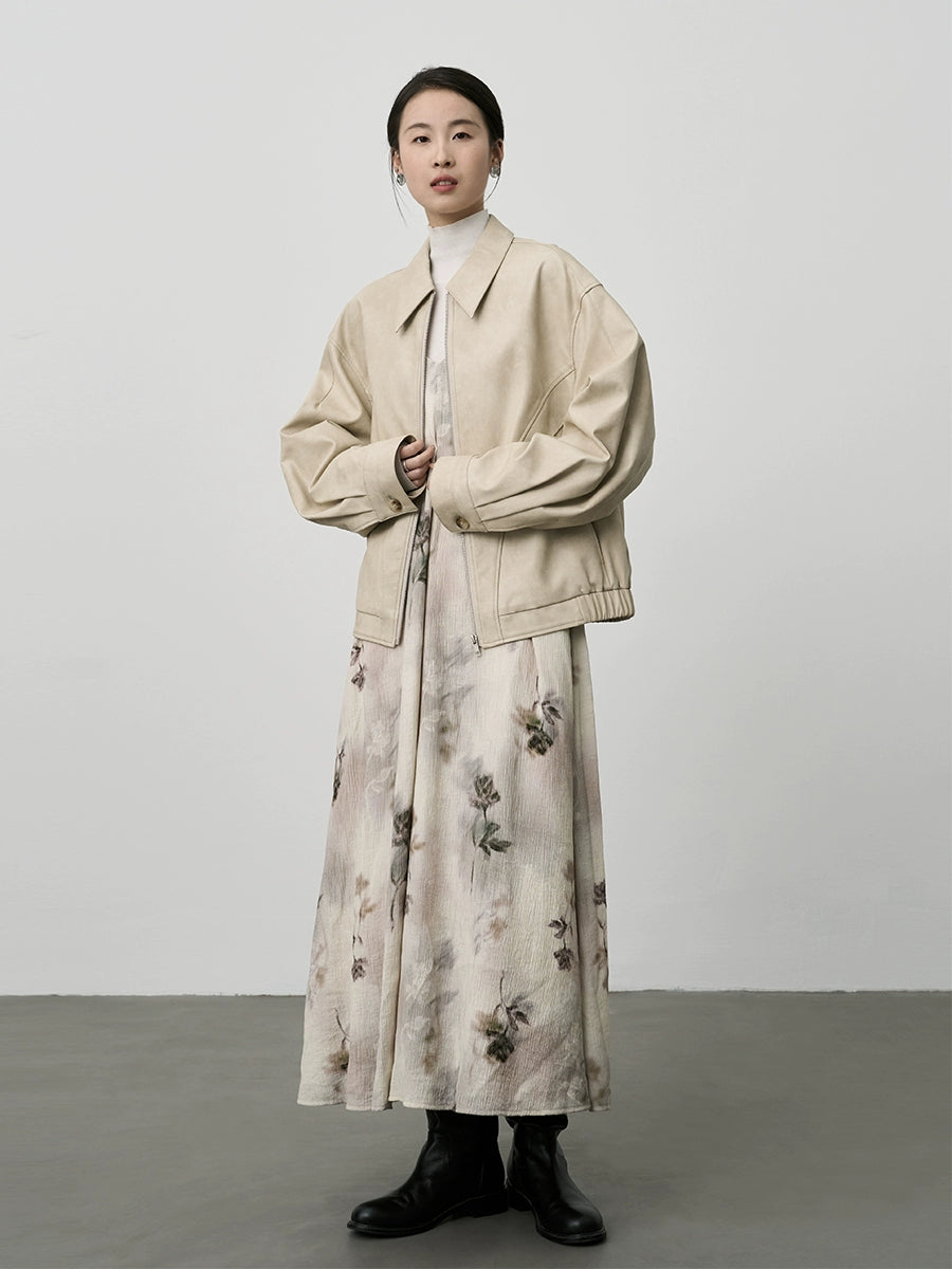 CAREMIND Chaqueta corta elegante de PU para motocicleta en color blanco roto Chaqueta de cuero versátil para primavera y otoño Ropa para mujer