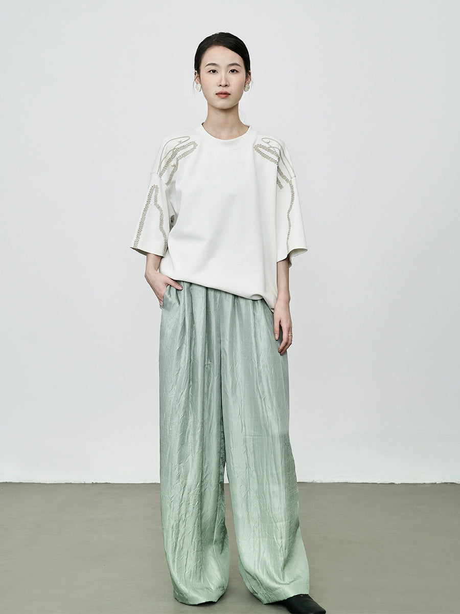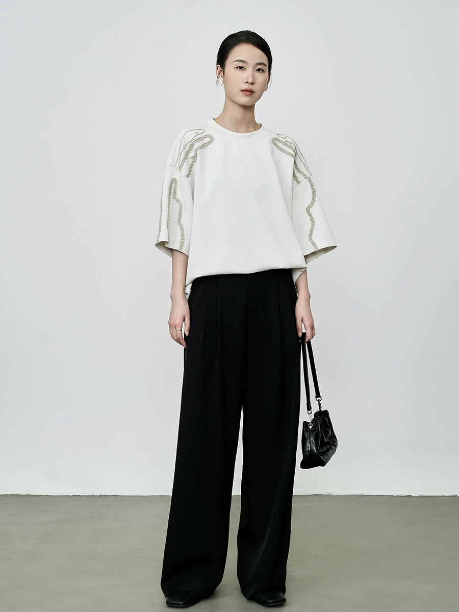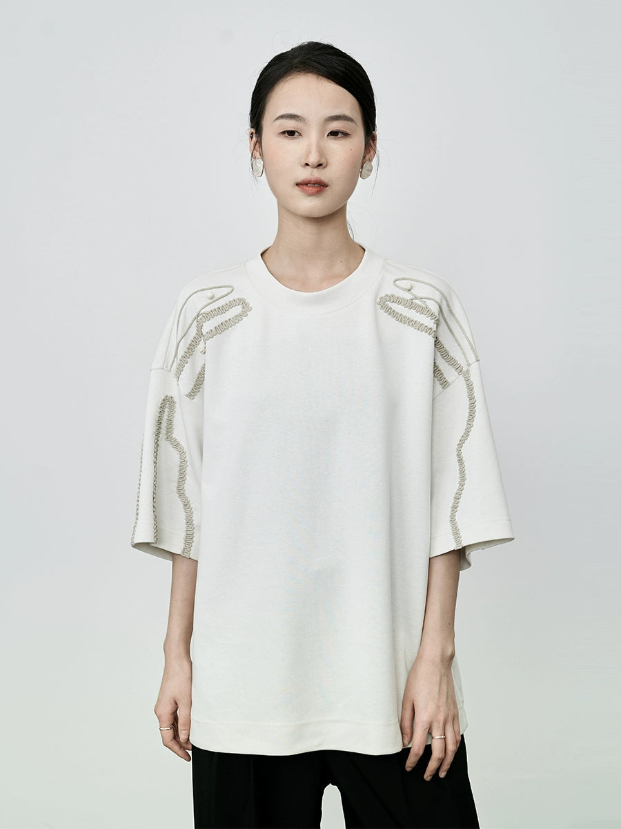 Camiseta informal holgada hecha a mano con cuentas de CAREMIND, patrón de papel industrial pesado, blusa bordada china de manga corta