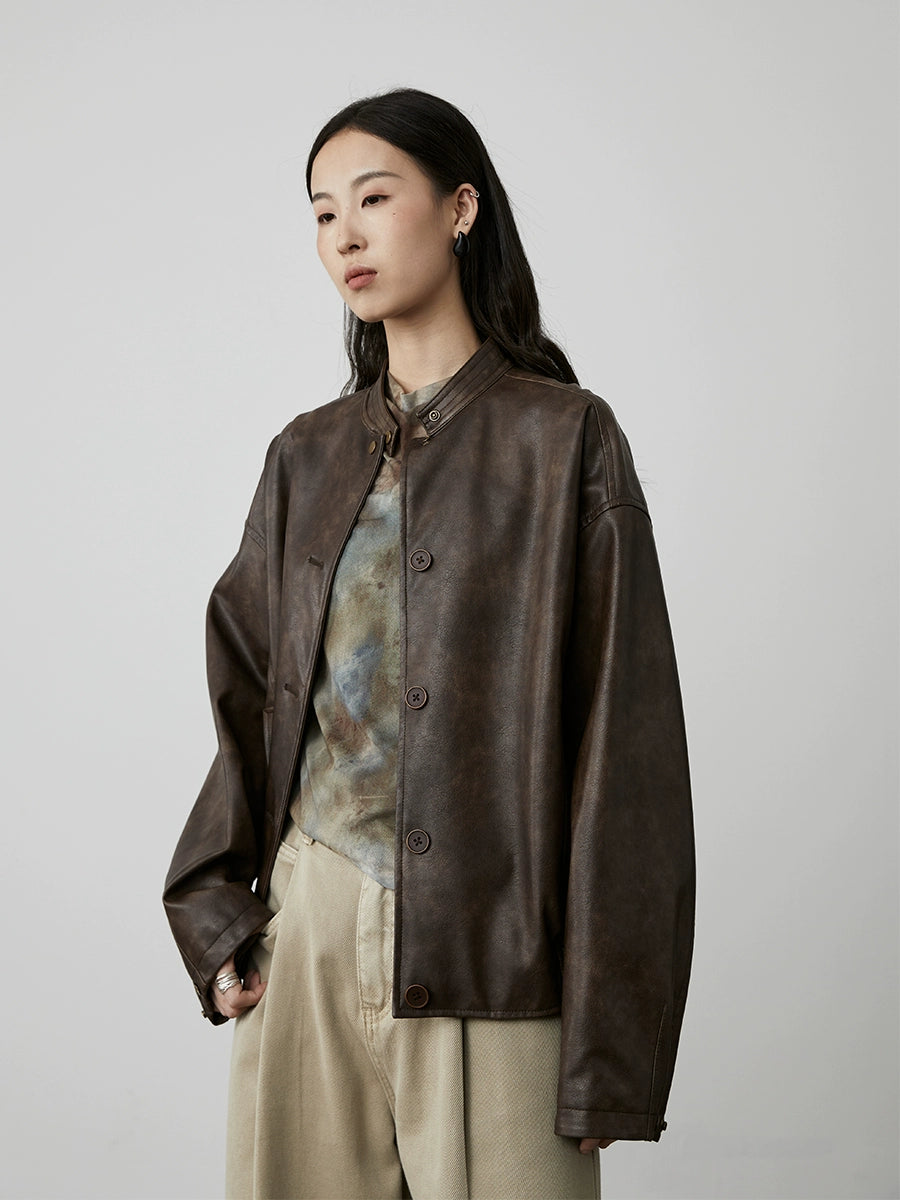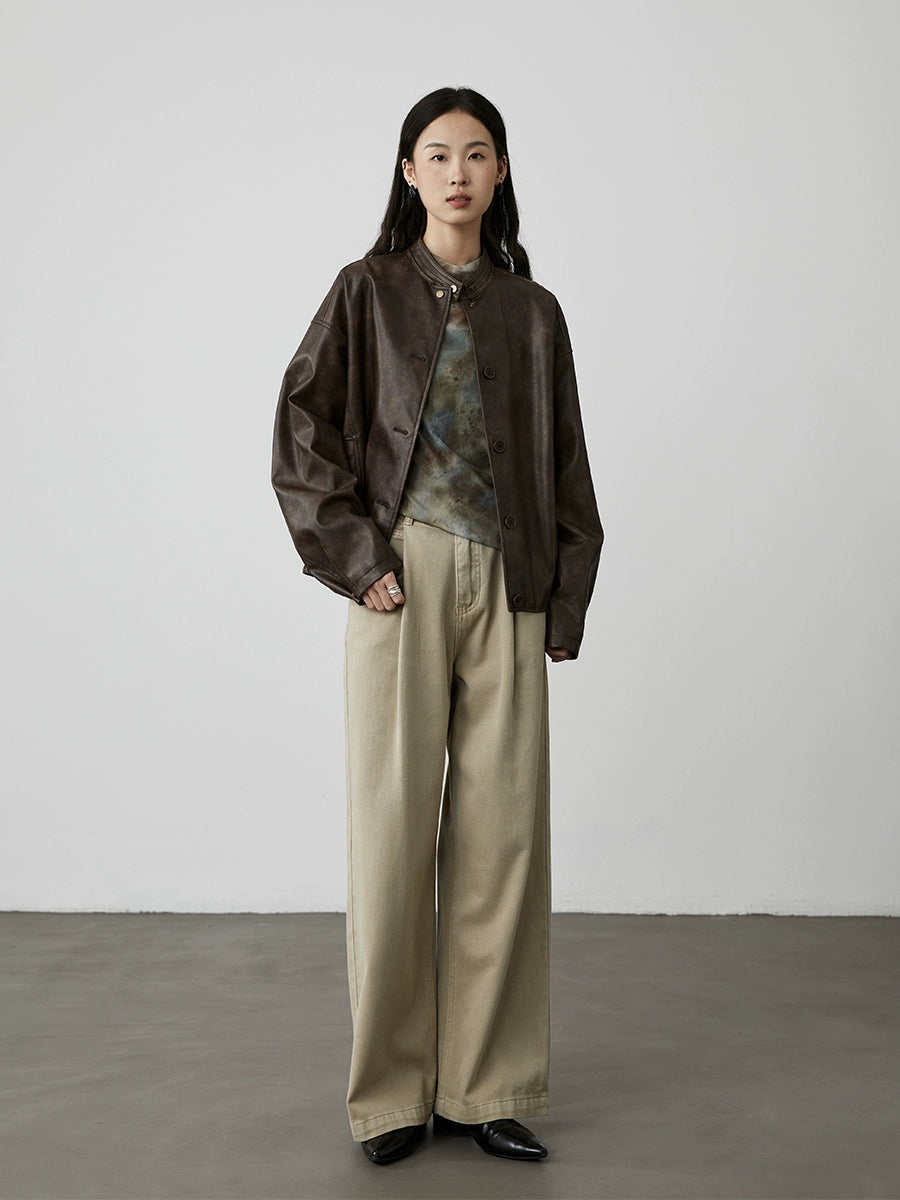 CAREMIND Chaqueta de cuero negra de temperamento retro estilo Hong Kong 2024 nueva chaqueta de cuero con silueta de agua de lavado superior simple