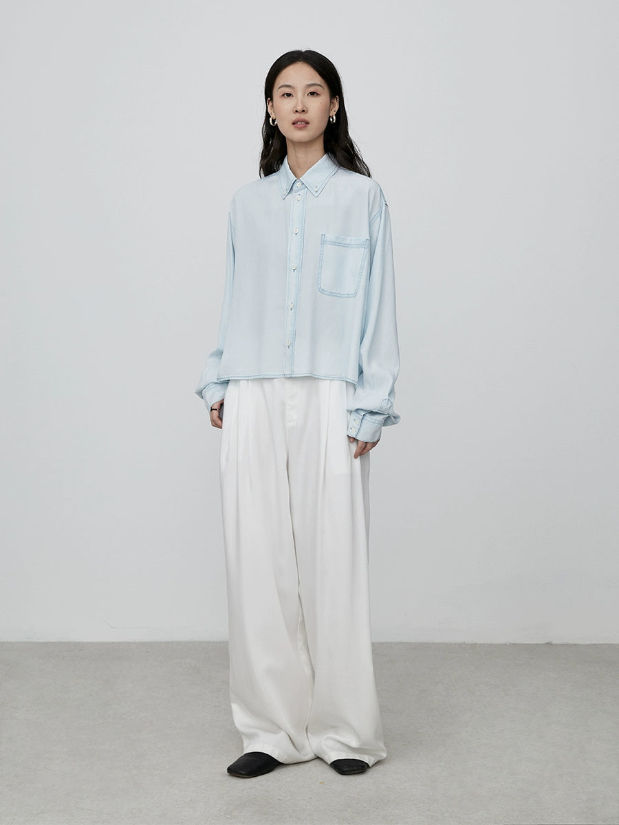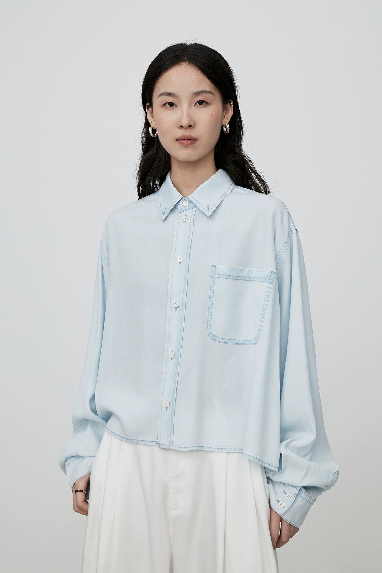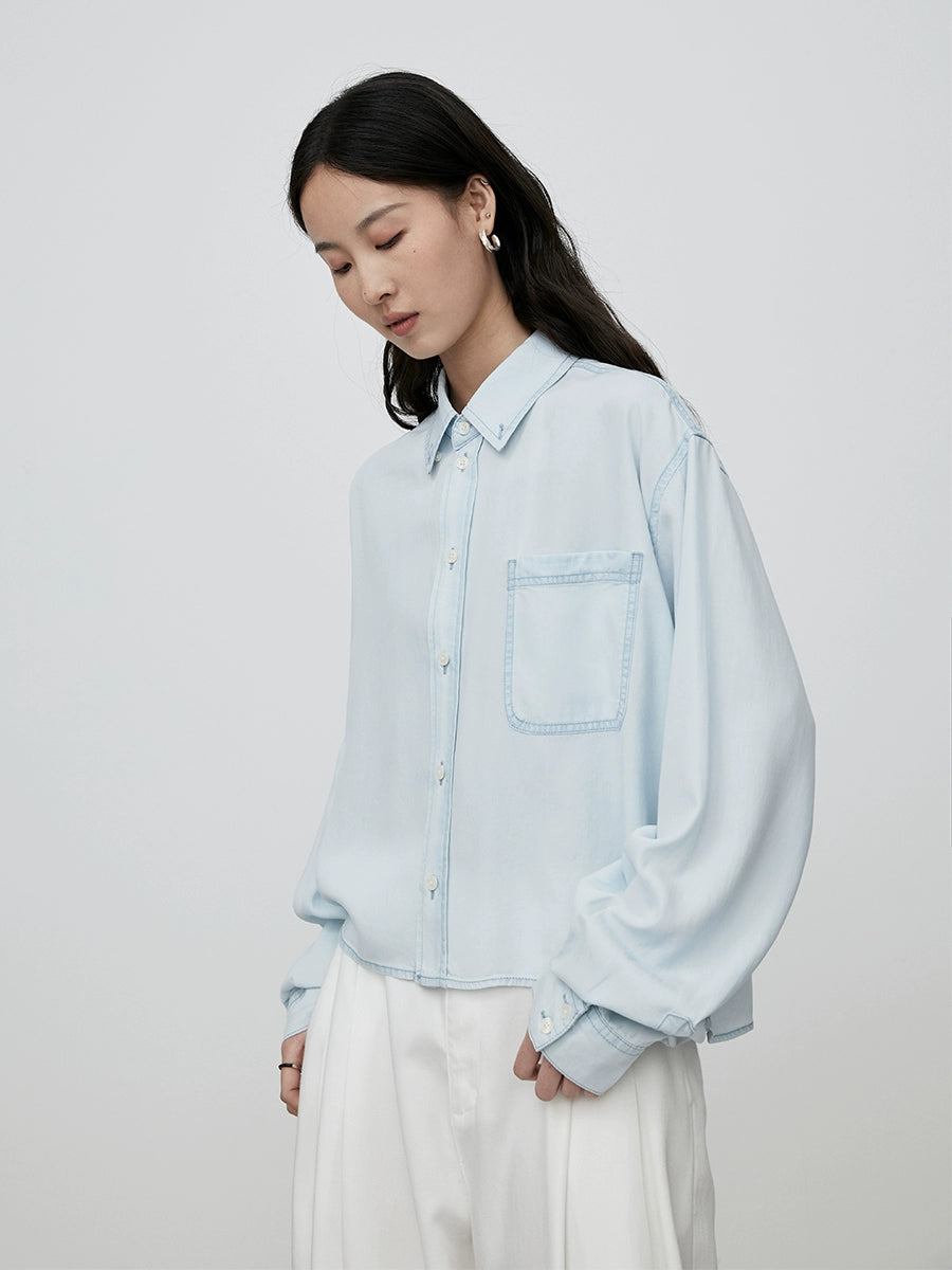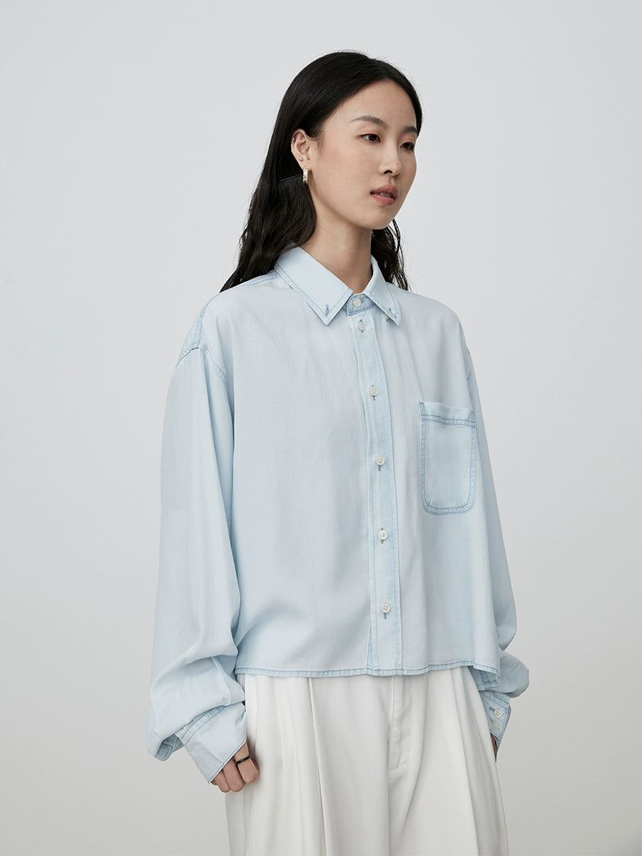 Camisa tipo polo de tencel azul claro CAREMIND, corta, informal, estilo extranjero, fina, manga larga, tipo cárdigan
