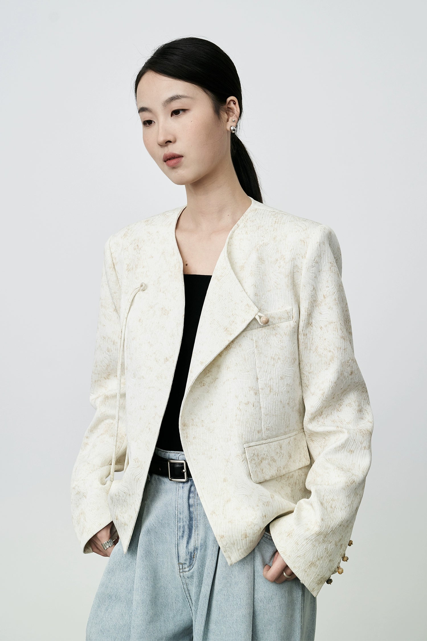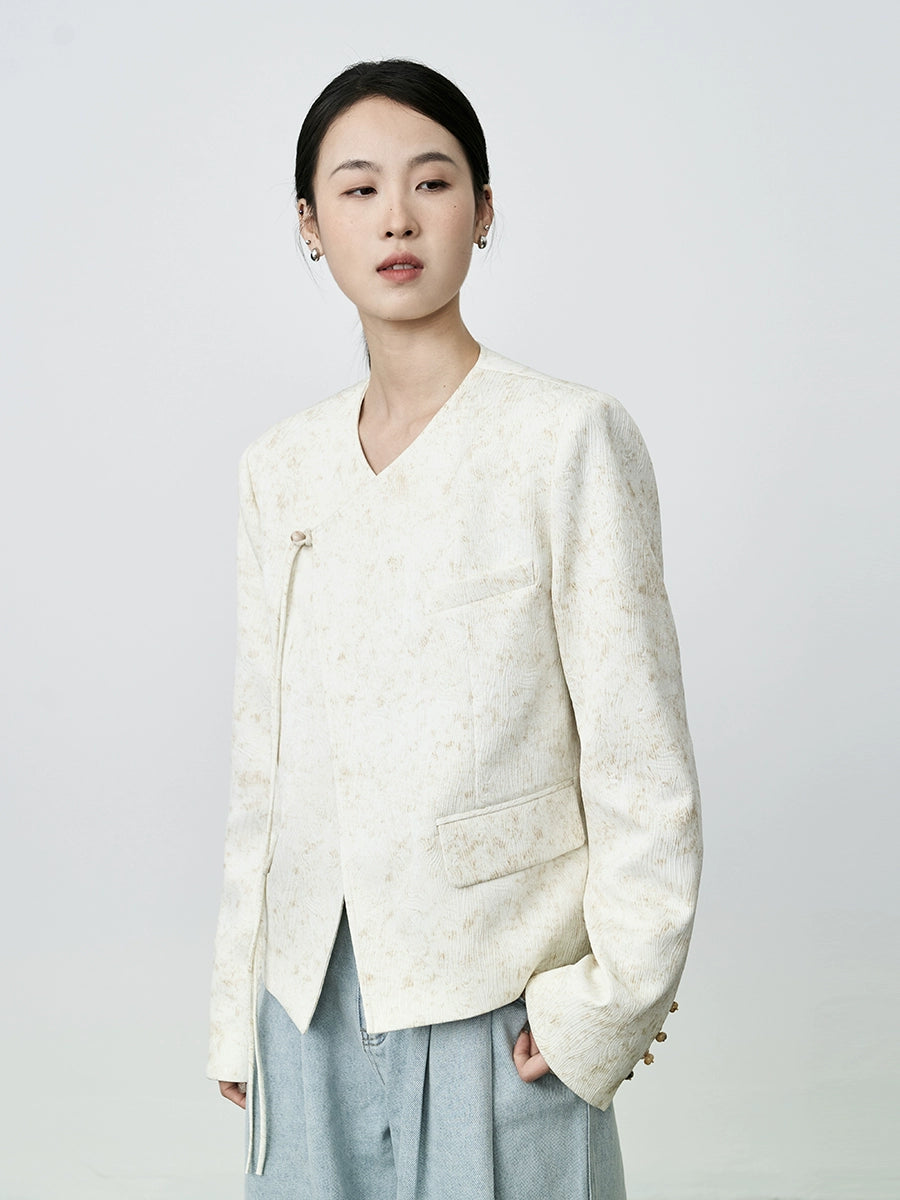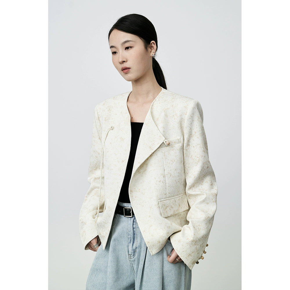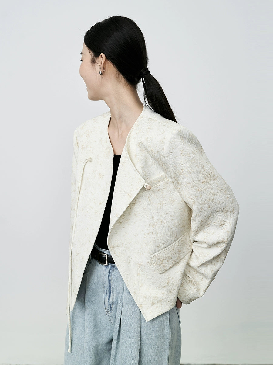 CAREMIND Nuevo abrigo corto de estilo nacional chino con hebilla de disco beige y textura pequeña y fragante para mujer