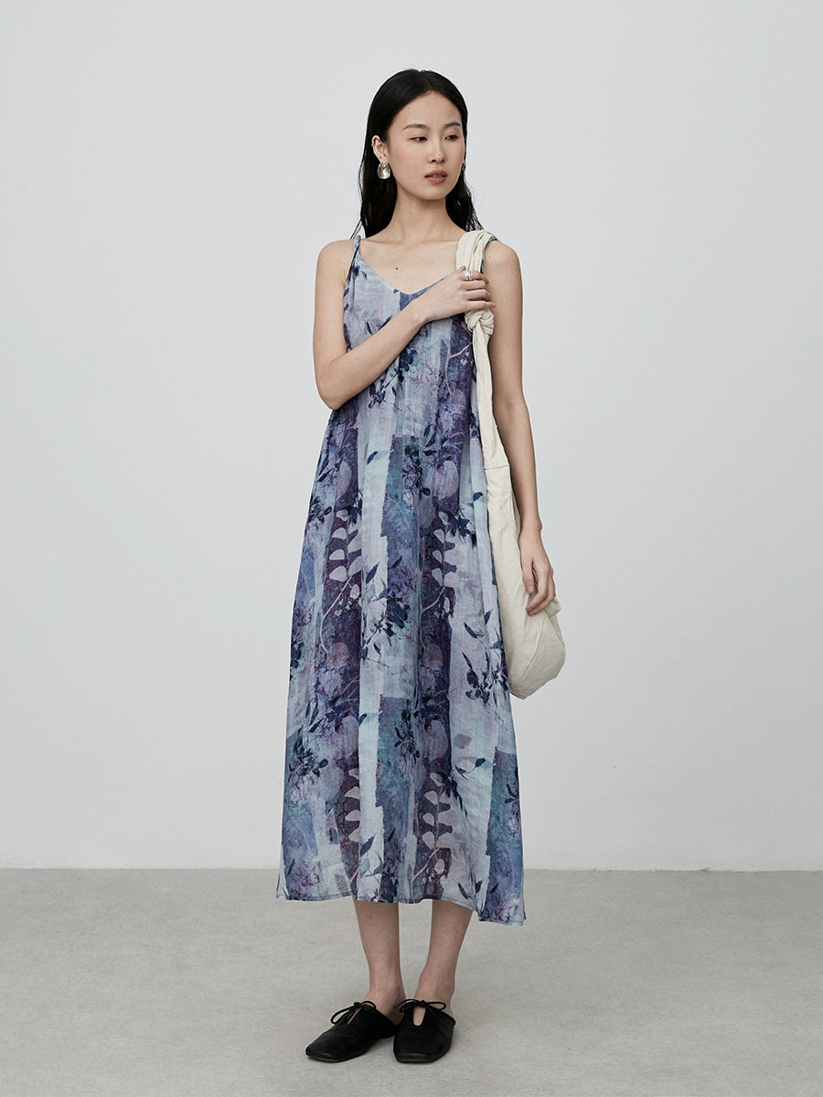 Vestido retro holgado sin mangas con falda con tirantes y estampado morado para vacaciones en la playa de CAREMIND