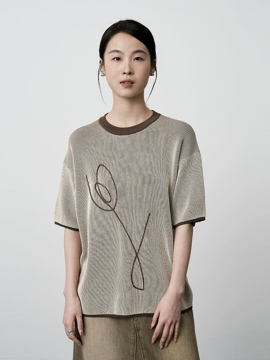 CAREMIND Haut élégant à manches courtes brodé de tulipes pour femme, rayé noir et blanc, couleur contrastante, simple, à manches moyennes