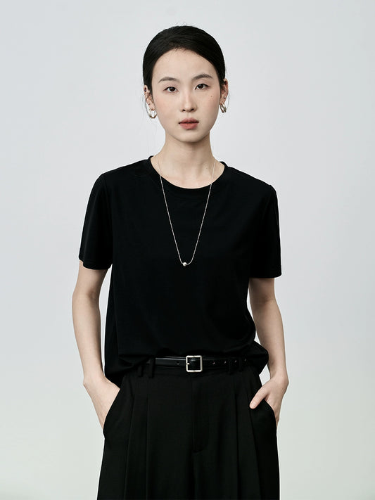 CAREMIND T-shirt classique basique à col rond et manches courtes pour femme, couleur unie, ample, épaules dénudées