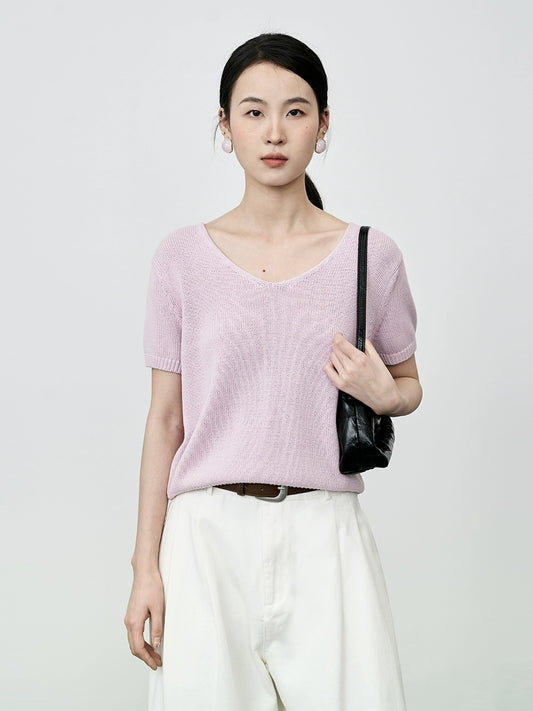 CAREMIND Pull décontracté en tricot 100 % coton torsadé, polyvalent, couleur unie, rajeunissant, manches courtes, pour femme