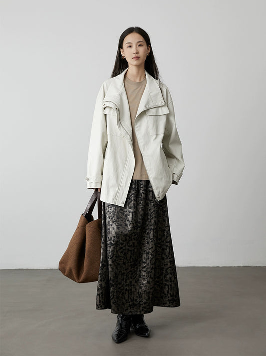 Jupe grise style national CAREMIND, jupe plissée taille haute en velours texturé, style national, avec éclaboussures d'encre et ondulations d'eau, automne